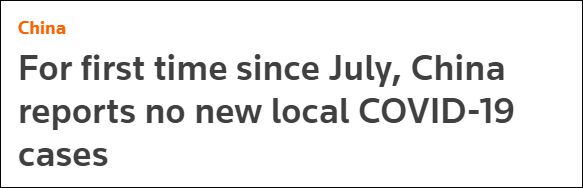 路透社称,自7月以来,中国..报告 无本土新增确诊病例,这表明了在中国“零容忍”政策和 各地强硬的防控举措下,中国的疫情正得到控制。